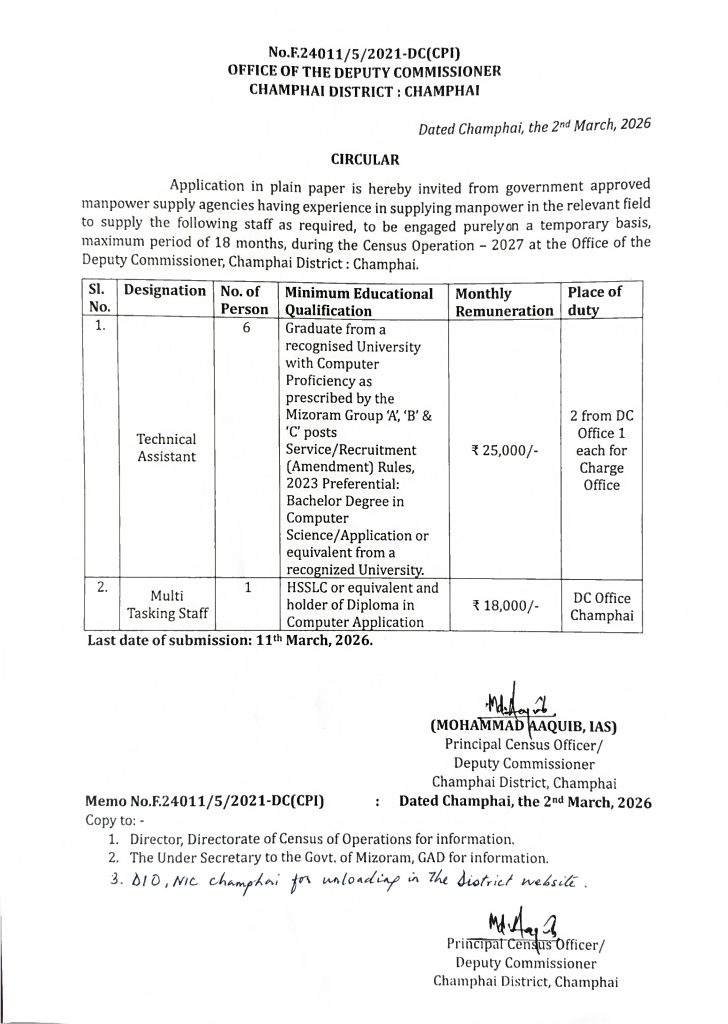 ♣ Saitual DC Hnaruak 2027 cencus Technical assistant/MTS advertisement download